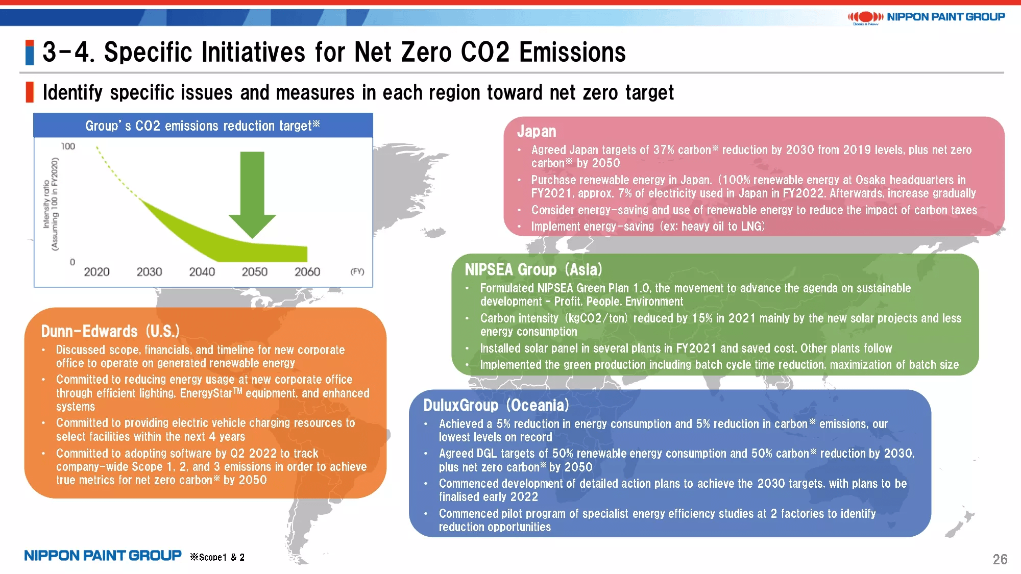 The first is our initiatives for net zero CO2 emissions. By sharing information about the initiatives in each operating region and learning from best practices while respecting the characteristics of every operating region, we will continue our cross-functional activities throughout the Group.