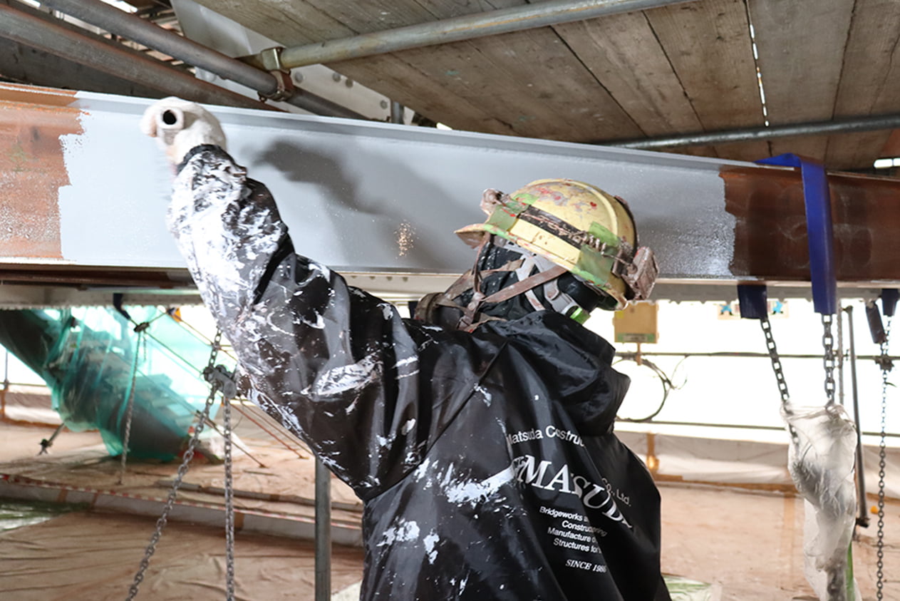 In salt-laden environments, protective coatings typically require a four-layer system - two primer coats, one intermediate coat, and one topcoat - to effectively block corrosion factors. Danziora E Primer delivers exceptional barrier performance, providing equal or superior protection to two conventional primer coats with only a single application. This innovation allows the primer layer, traditionally requiring a dry film thickness of 120 μm (1 μm = 1/1000 mm), to be reduced by half while maintaining high protective capability. Furthermore, increasing the thickness of the topcoat makes it possible to eliminate the intermediate coat entirely. The result is a thinner overall film, a simplified application process, shorter project timelines, reduced paint consumption, and lower environmental impact. In January 2025, Danziora was selected for repair work on the Waka-To Bridge in Kitakyushu City, a structure designated as a National Important Cultural Property. We will continue to actively promote this nationally recognized technology and expand its adoption in future infrastructure preservation projects.