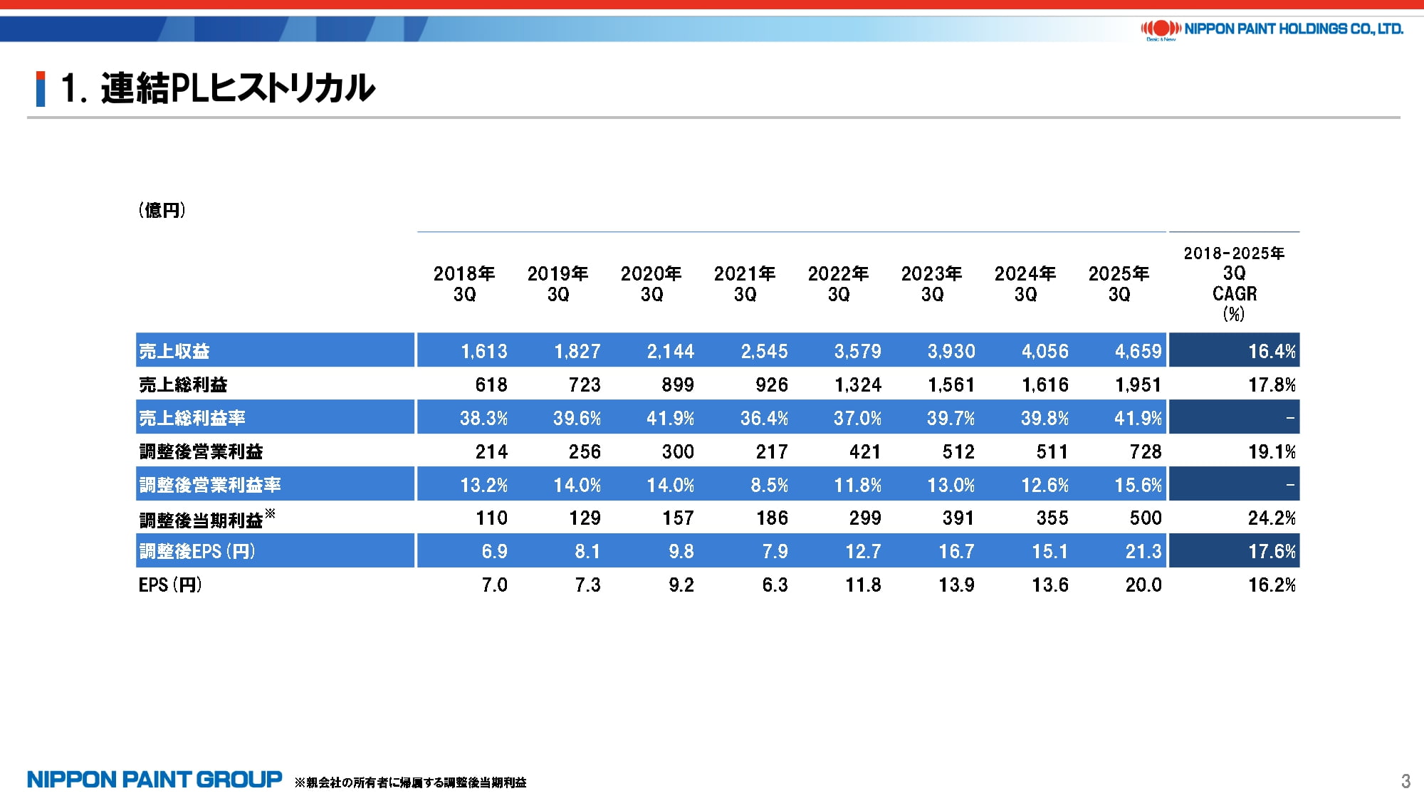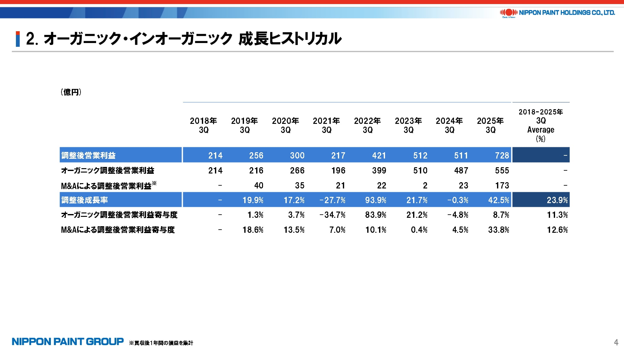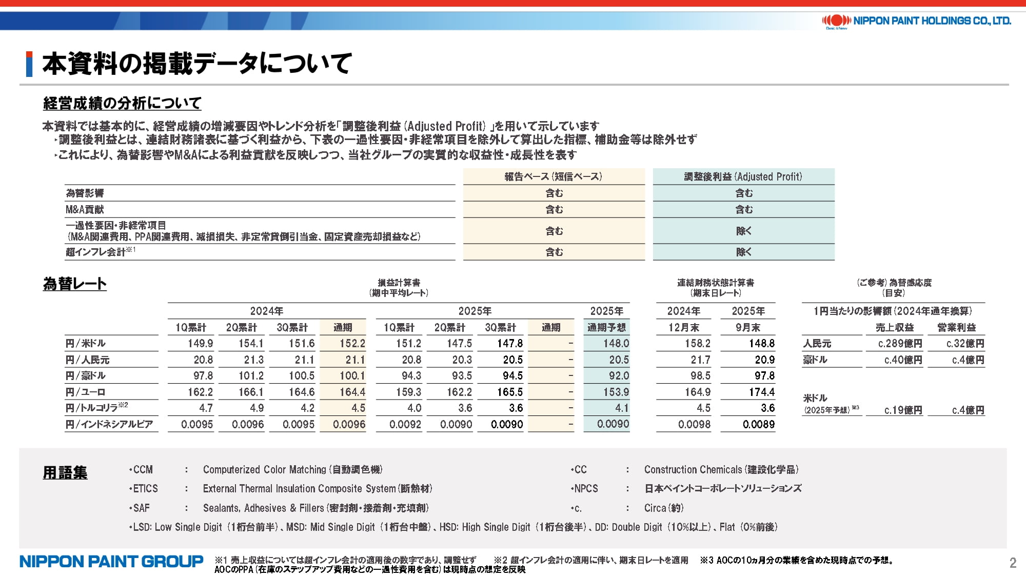 背景としては、私自身が数多くの投資家と面談を重ねる中、さまざまなフィードバックを直接・間接に受けています。そうした中には特に海外の機関投資家から、「同業他社と比較する際に海外の発行体の多くはさまざまな調整項目を除外した「調整後利益」を公表しているのに対し、日本ペイントは細かいディスクロージャーをするのは良いものの、パッと見分かりにくい」というご意見が多くありました。同時に、「数字が多過ぎるあまり、好決算であっても第一印象として伝わりにくい」というご意見もありました。こうした声を受けて、まずは当社の実力を正しくご理解いただき、海外の発行体との適正な比較ができるよう、今般「調整後利益」を積極的に開示するようにしました。説明資料P2の上段でご説明している通りです。