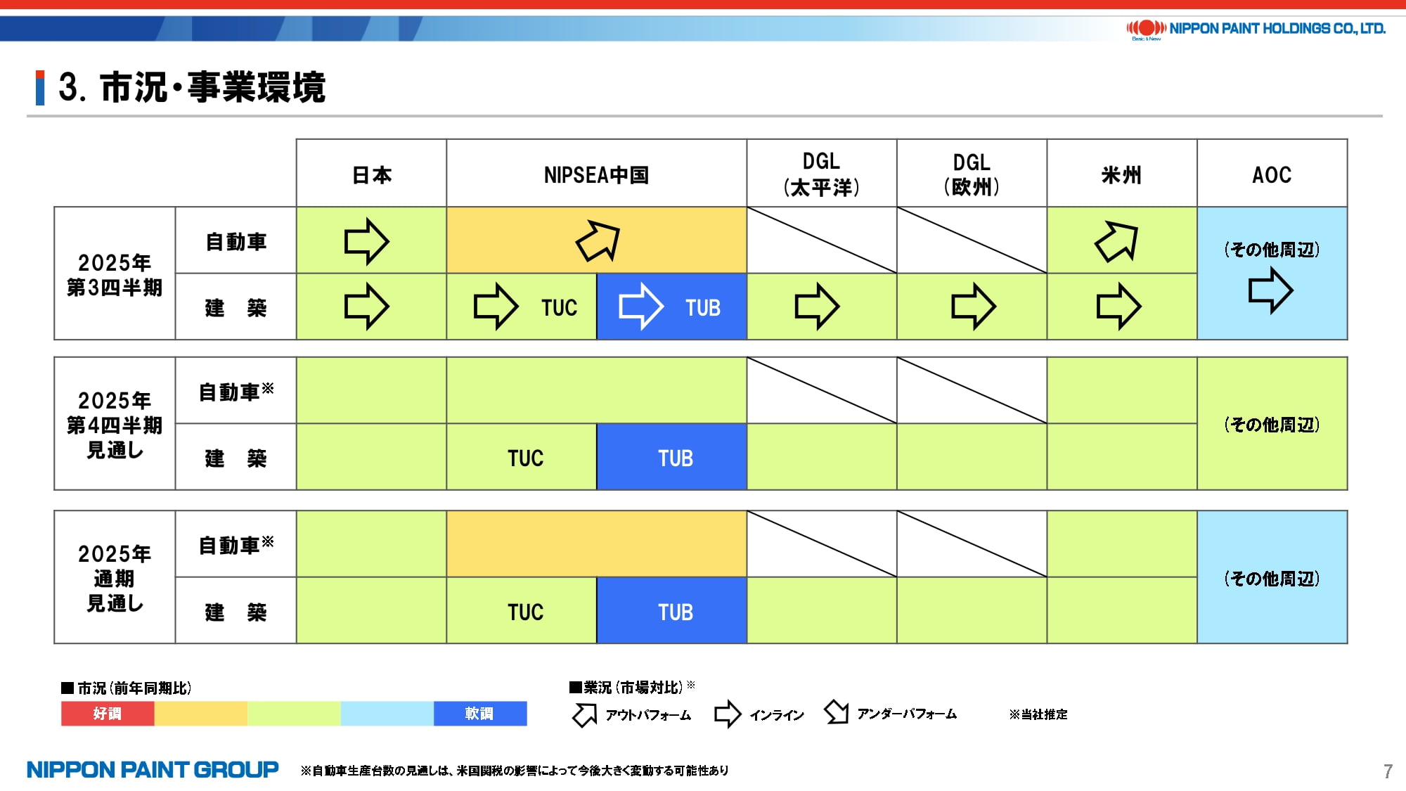 3. NIPSEA中国以外については、全般的に増収増益の基調となる中、インドネシアは販売数量が+MSDとなるも、為替影響はマイナスに寄与しました。トルコは販売数量、価格/ミックスともに2桁成長となりました。今回の新たな調整後利益においては、超インフレ会計の適用を調整していることを付言しておきます。