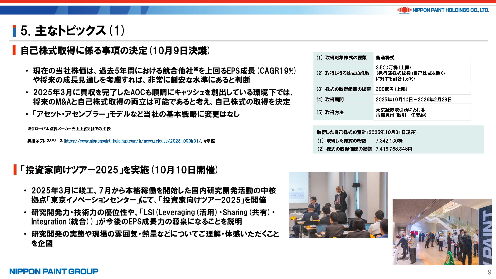この自己株式取得についても資本市場からの声に耳を傾け、9月の取締役会で十分な審議を経た上で実行に至りました。今回の開示方法の変更も含めて、今後も市場参加者の皆様との建設的な対話を継続したいと考えていますので、よろしくお願いいたします。