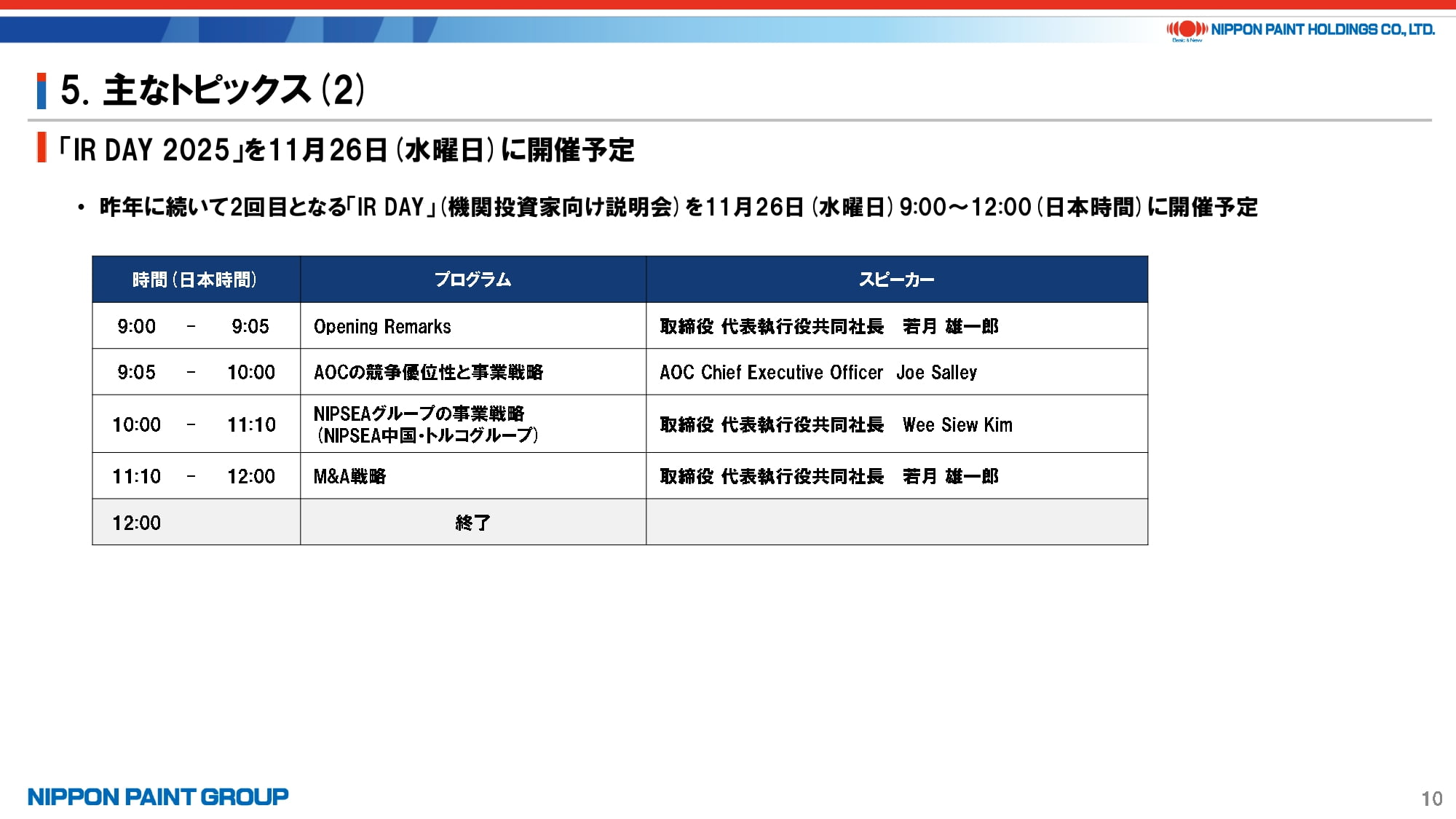 3つ目は、来る11月26日(水曜日)に「IR DAY」の開催を予定しています。今回はAOCからのプレゼンテーションもありますので、日本時間の午前中に実施いたします。共同社長2名も登壇しますので、ぜひご参加いただければ幸いです。