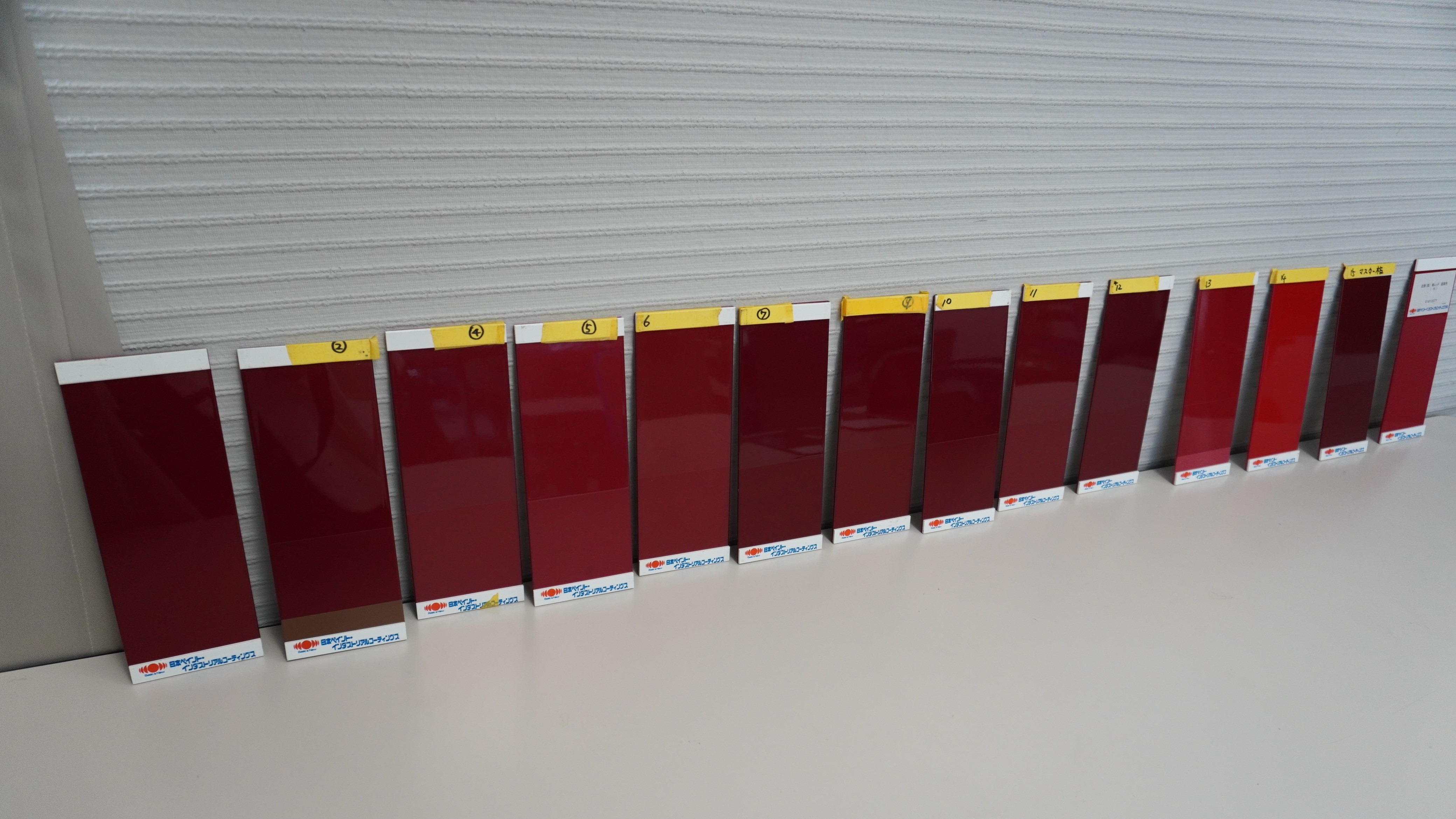 鉄道車両用の塗料は実績のある材料から選ぶことが基本となります。鉄道車両に使う材料には決められた規格があり、新しい材料を採用すると提案までに時間がかかるためです。材料は赤色だけで約20種類、青色だと10種類は超えてきます。メタリックカラーも20種類程度あり、組み合わせ次第では何万通りにもなります。まず、平らな板に塗って発色を確認した後、山型の立体物に塗って色の陰影を確かめます。ある程度、色のイメージが固まってきたら、大きな面積に塗って再び確認していきます。これを繰り返すことで、最適な色を選んでいきます。色を決定する過程では、お客様と開発担当者の間をつなぐ役割を担うデザイナーのコミュニケーション能力が重要です。対話を重ね、きめ細かな修正を行うことで、お客様が理想とする色をカタチにしています。
